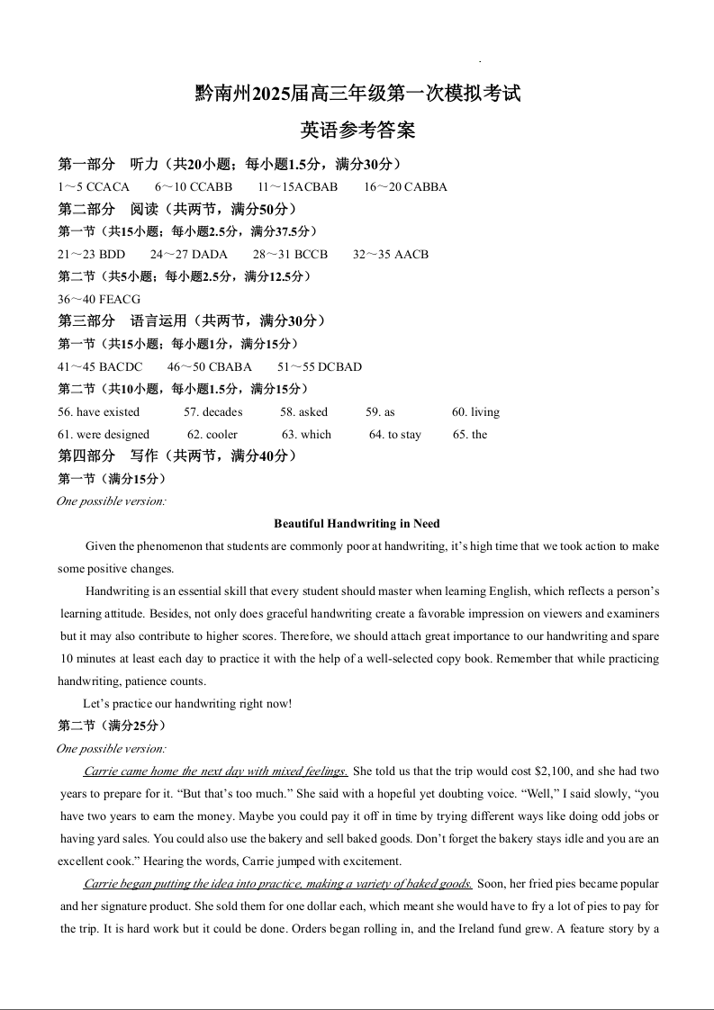 黔南州2025届高三年级第一次模拟考试 英语答案