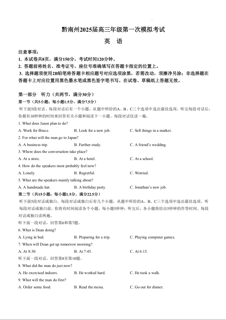 黔南州2025届高三年级第一次模拟考试 英语