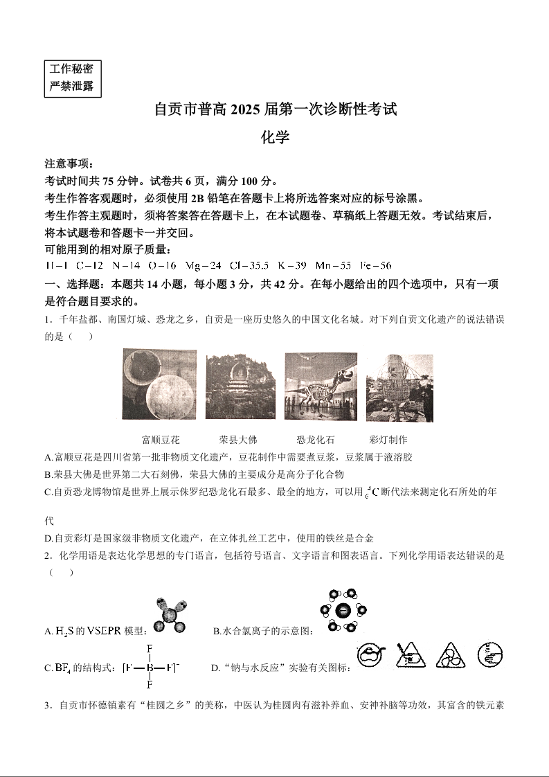 四川省自贡市普高2025届第一次诊断性考试 化学
