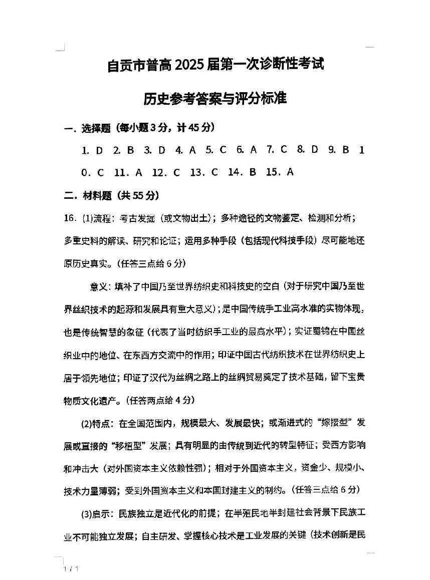 四川省自贡市普高2025届第一次诊断性考试 历史答案