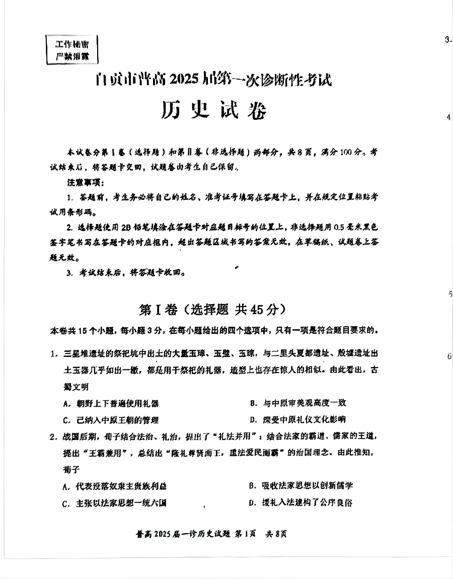 四川省自贡市普高2025届第一次诊断性考试 历史