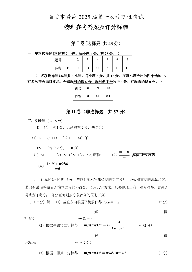 四川省自贡市普高2025届第一次诊断性考试 物理答案