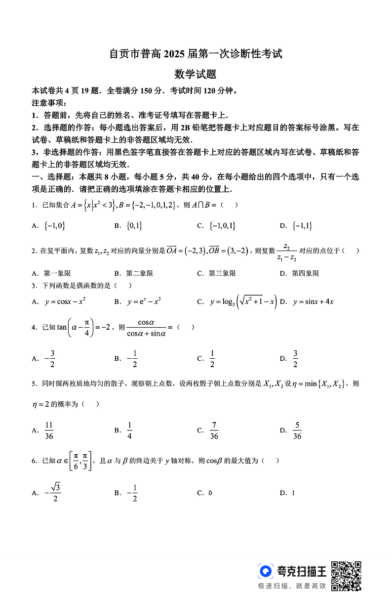 四川省自贡市普高2025届第一次诊断性考试 数学