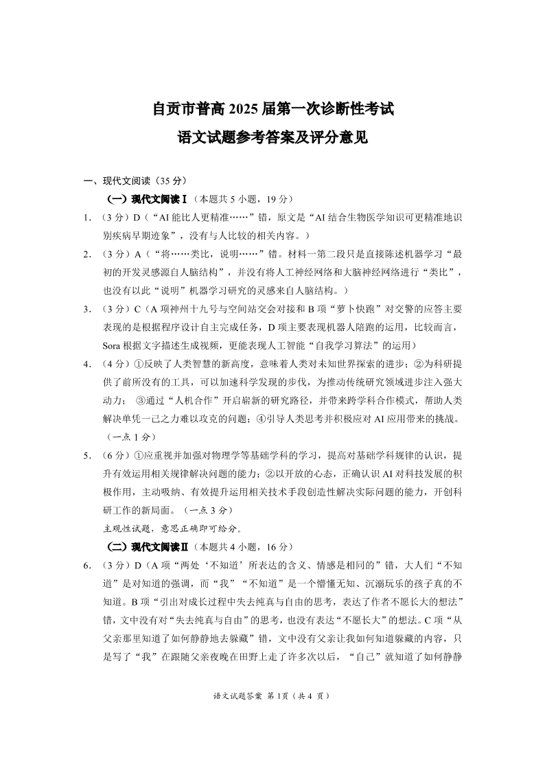 四川省自贡市普高2025届第一次诊断性考试 语文答案