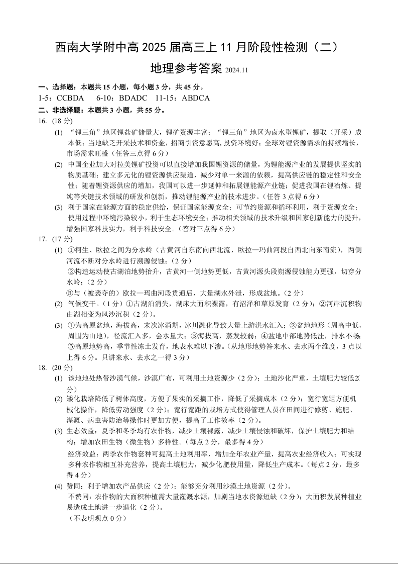 西南大学附中高2025届高三上11月阶段性检测(二)地理答案