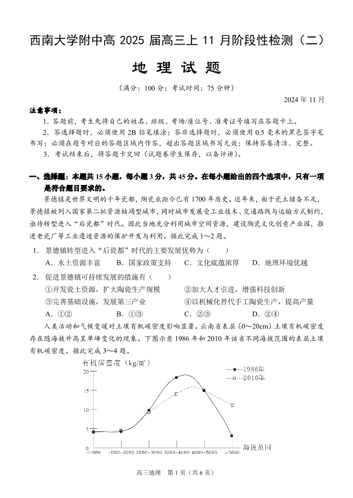 西南大学附中高2025届高三上11月阶段性检测(二)地理