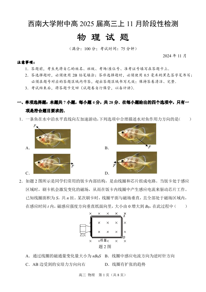 西南大学附中高2025届高三上11月阶段性检测(二)物理