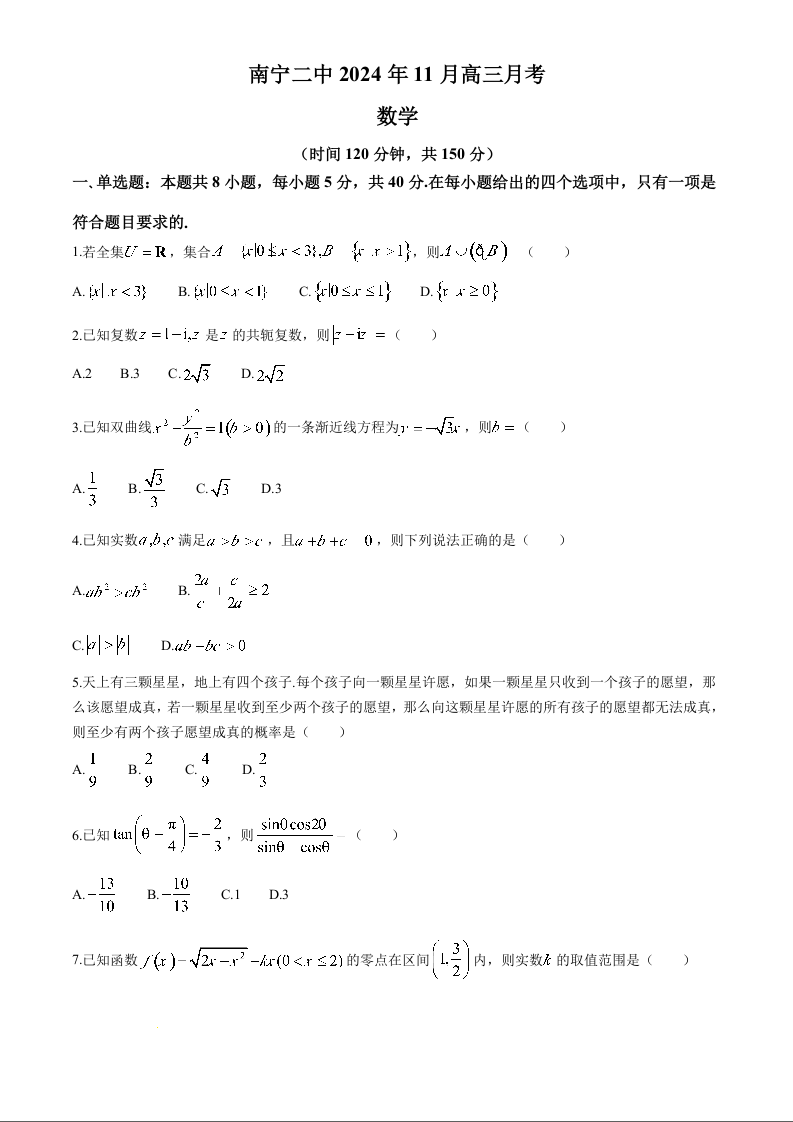 南宁二中2024年11月高三月考 数学