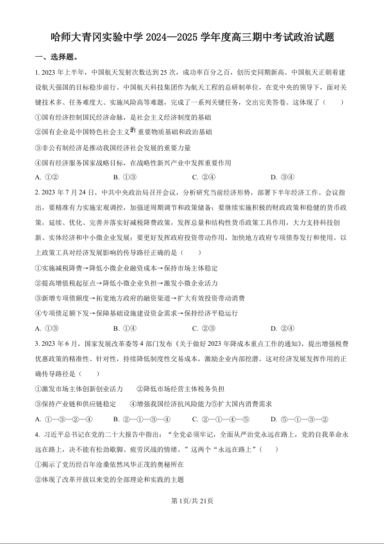 黑龙江省哈尔滨师范大学青冈实验中学校2025届高三上学期期中考试 政治