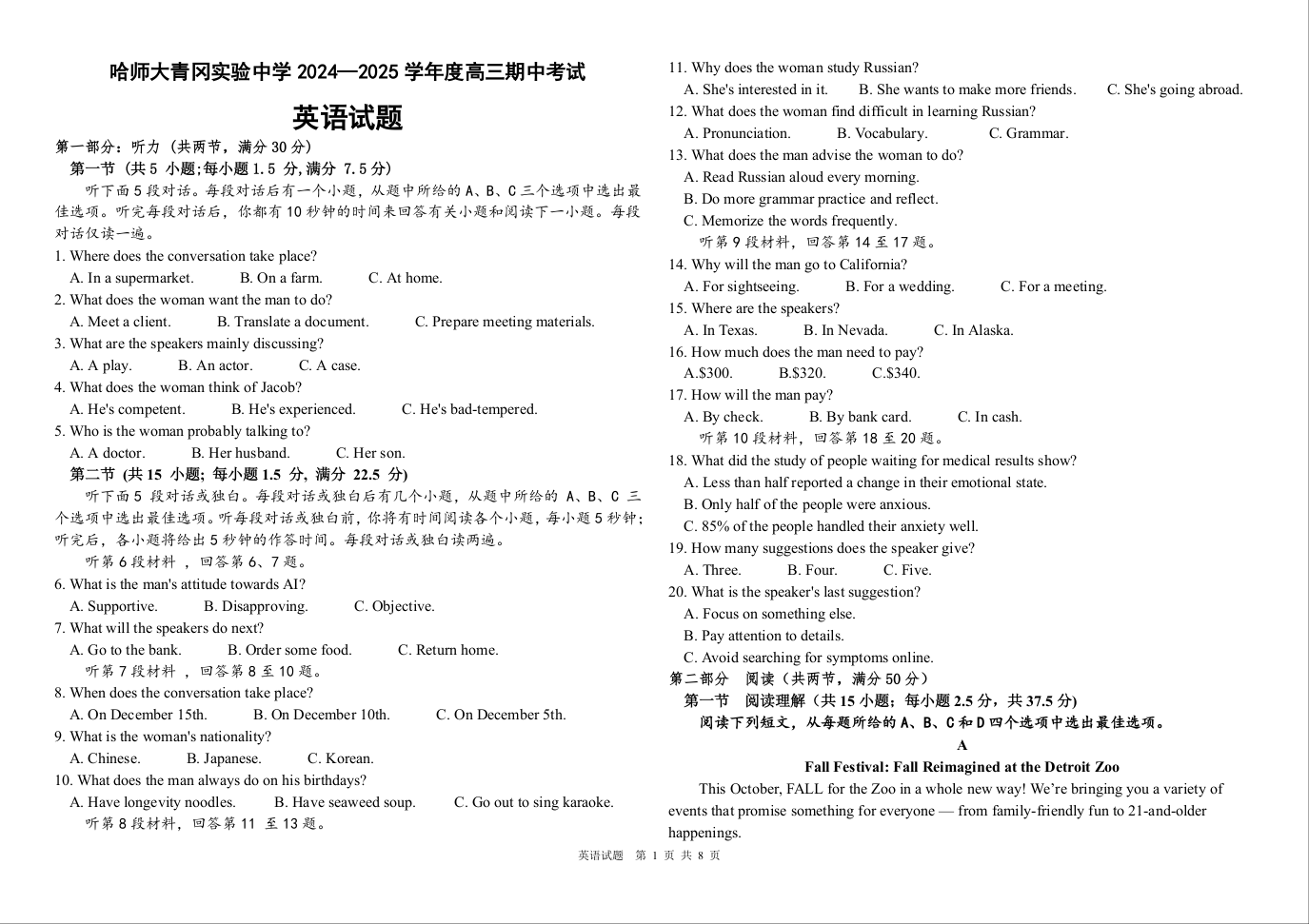 黑龙江省哈尔滨师范大学青冈实验中学校2025届高三上学期期中考试 英语