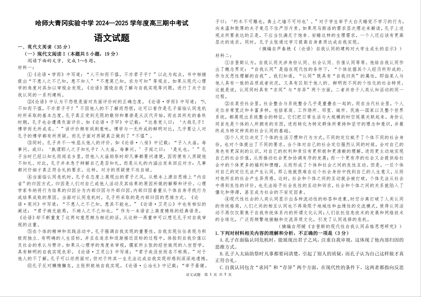 黑龙江省哈尔滨师范大学青冈实验中学校2025届高三上学期期中考试 语文