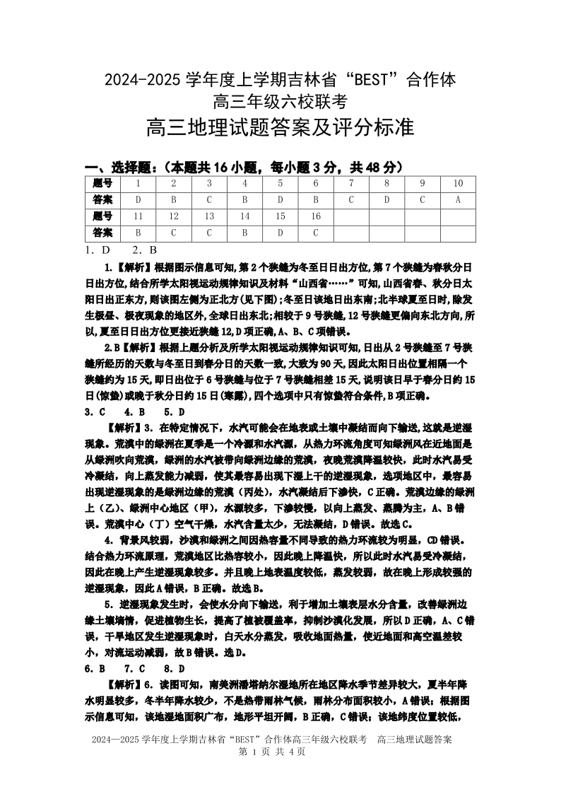 吉林省“BEST”合作体六校2025届高三上学期第三次联考 地理答案