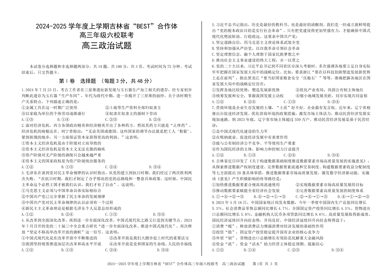 吉林省“BEST”合作体六校2025届高三上学期第三次联考 政治