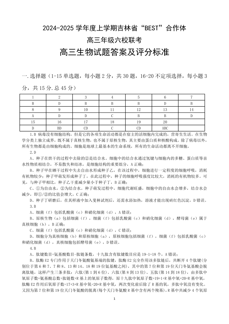 吉林省“BEST”合作体六校2025届高三上学期第三次联考 生物答案