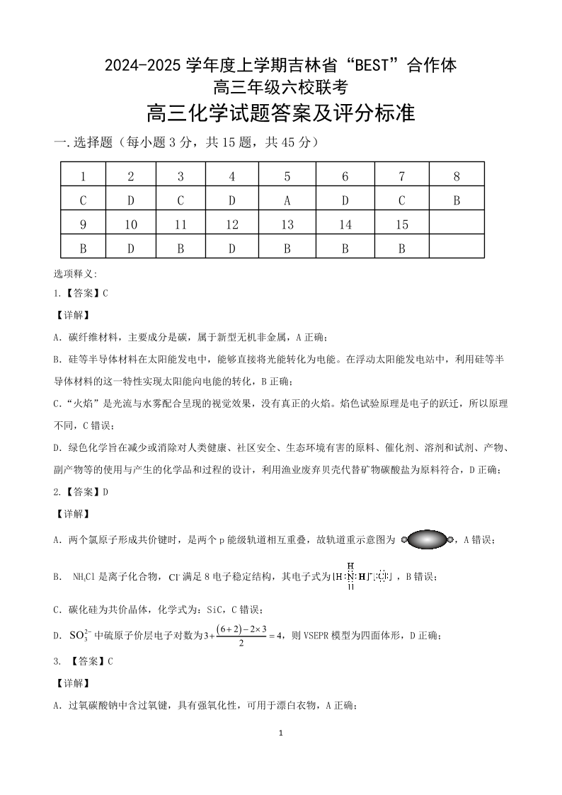 吉林省“BEST”合作体六校2025届高三上学期第三次联考 化学答案