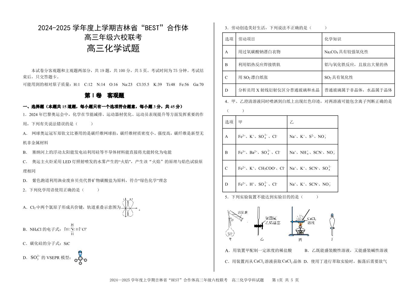 吉林省“BEST”合作体六校2025届高三上学期第三次联考 化学