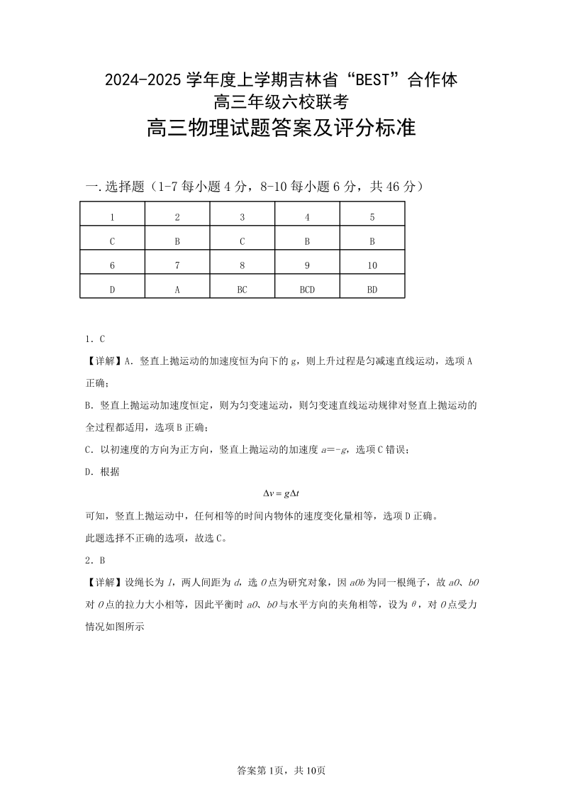 吉林省“BEST”合作体六校2025届高三上学期第三次联考 物理答案