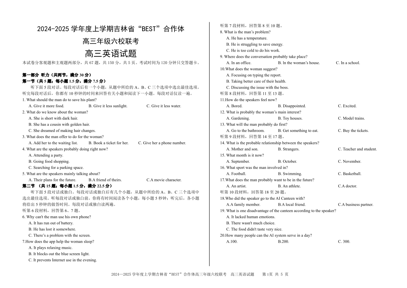 吉林省“BEST”合作体六校2025届高三上学期第三次联考 英语