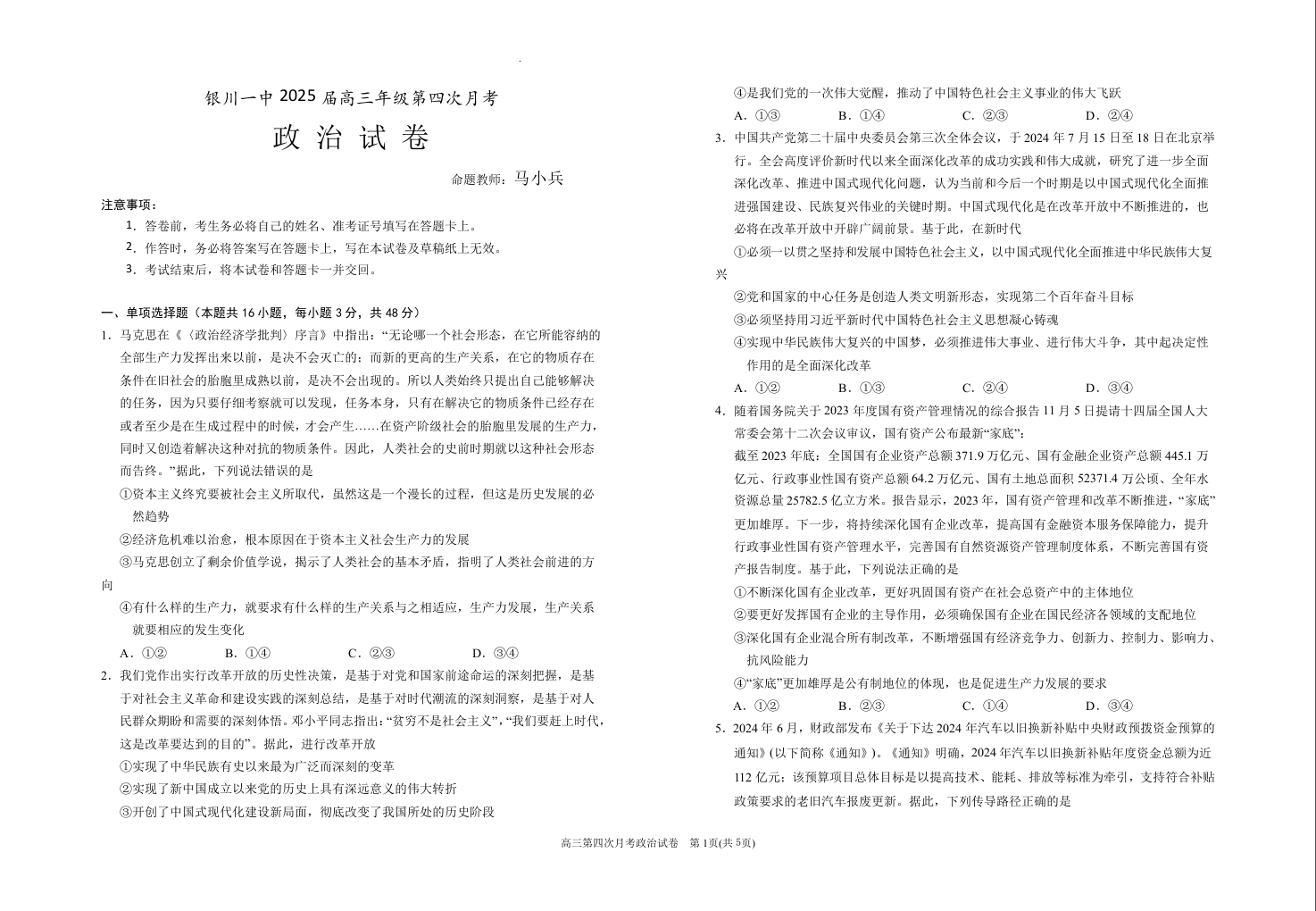 宁夏银川一中2025届高三上学期第四次月考 政治