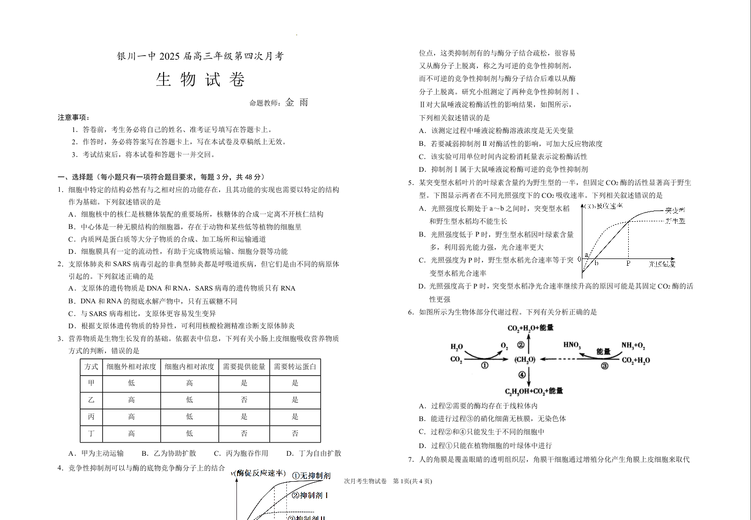 宁夏银川一中2025届高三上学期第四次月考 生物