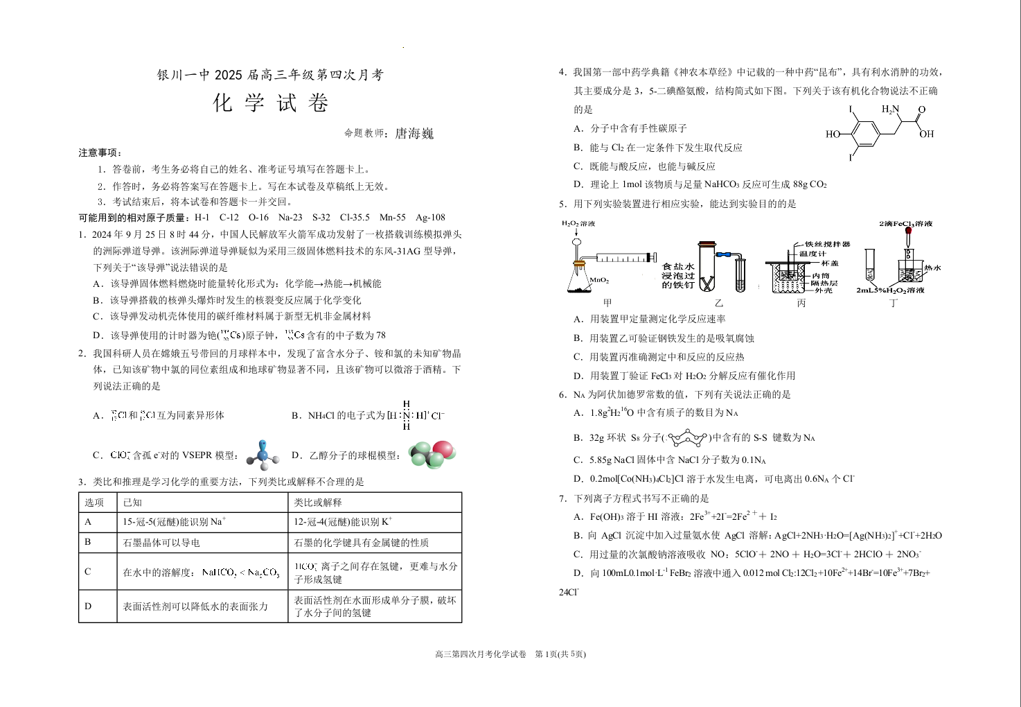 宁夏银川一中2025届高三上学期第四次月考 化学