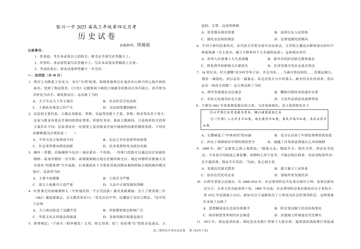 宁夏银川一中2025届高三上学期第四次月考 历史