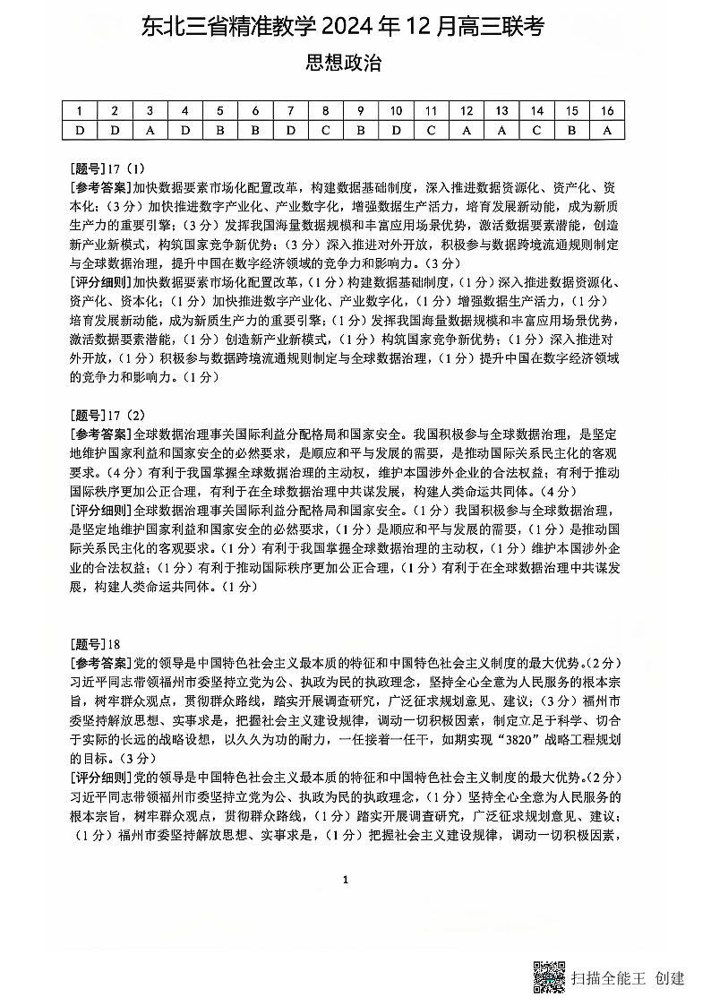 东北三省精准教学2024年12月高三联考 政治答案