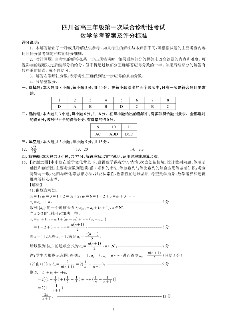 四川省高三年级第一次联合诊断性考试数学参考答案及评分标准