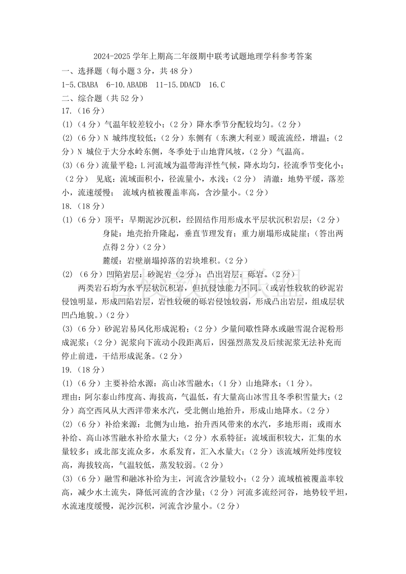河南省郑州十校联考2024-2025学年高二上学期11月期中考试 地理答案