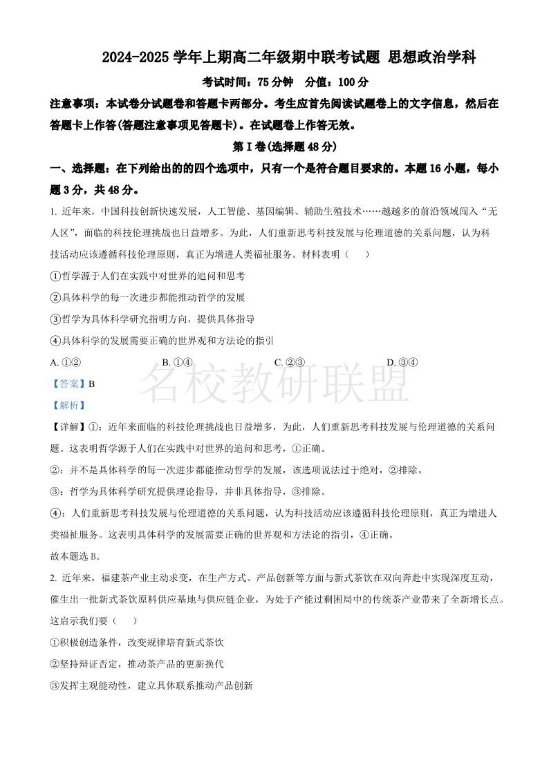 河南省郑州十校联考2024-2025学年高二上学期11月期中考试 政治答案