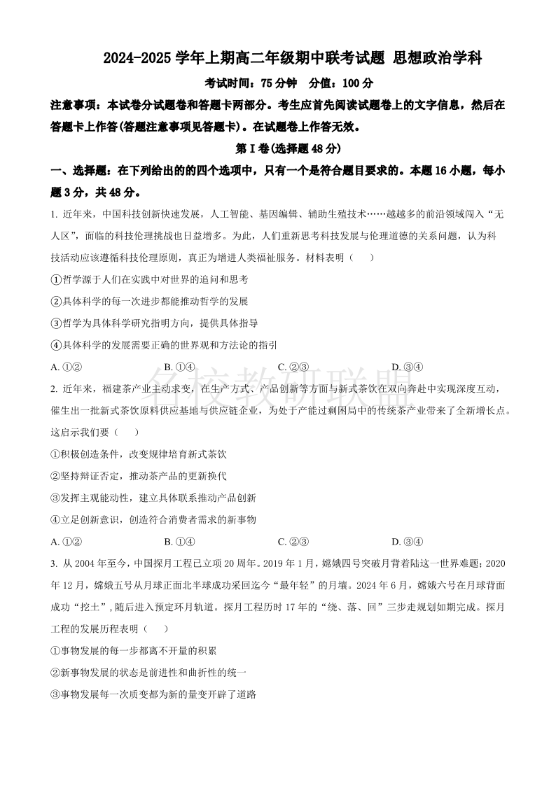 河南省郑州十校联考2024-2025学年高二上学期11月期中考试 政治