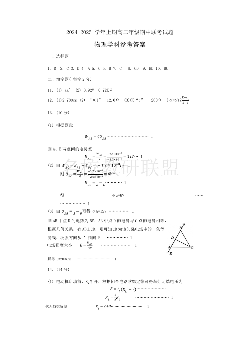 河南省郑州十校联考2024-2025学年高二上学期11月期中考试 物理答案