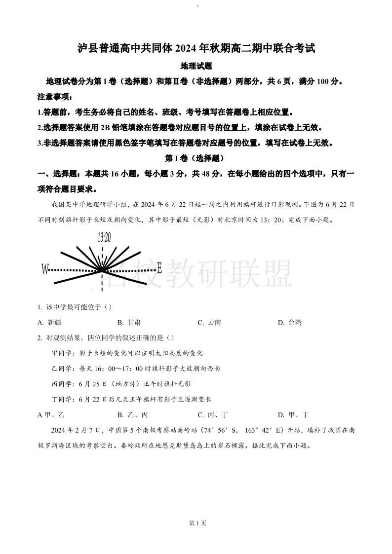四川省泸州市泸县普通高中共同体2024-2025学年高二上学期11月期中考试 地理