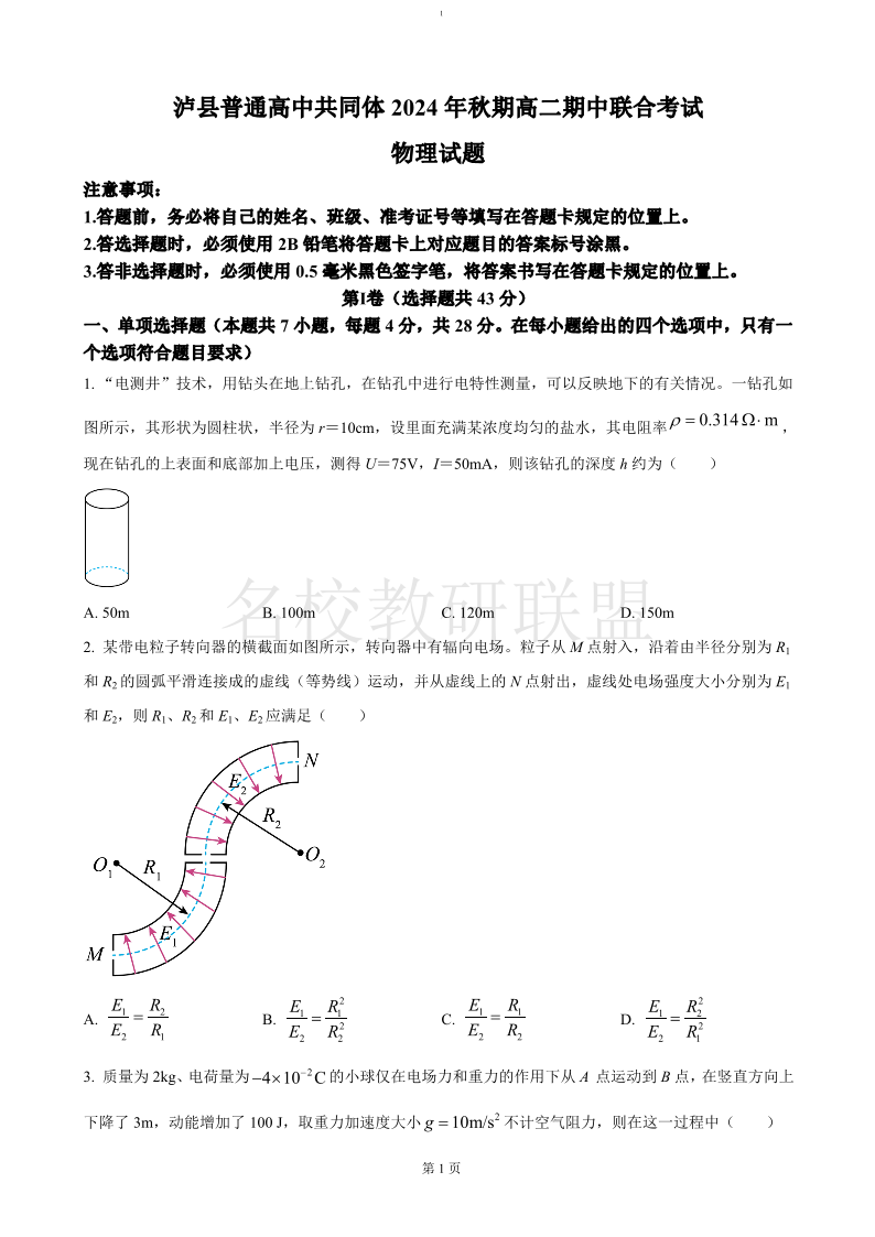 四川省泸州市泸县普通高中共同体2024-2025学年高二上学期11月期中考试 物理