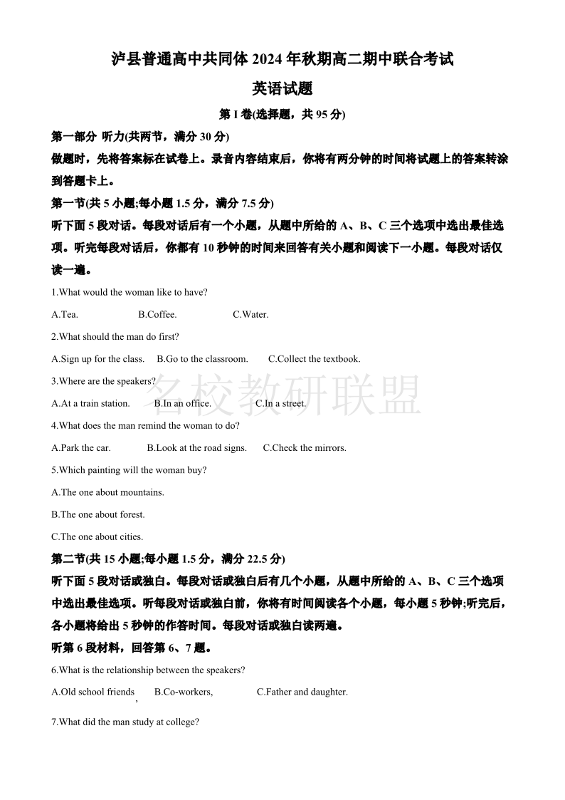 四川省泸州市泸县普通高中共同体2024-2025学年高二上学期11月期中考试 英语