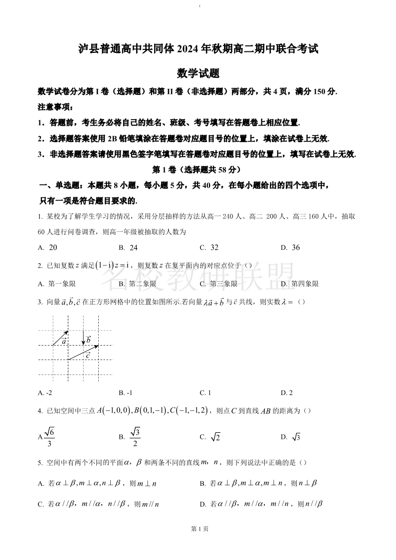 四川省泸州市泸县普通高中共同体2024-2025学年高二上学期11月期中考试 数学