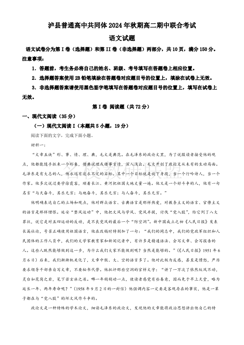 四川省泸州市泸县普通高中共同体2024-2025学年高二上学期11月期中考试 语文