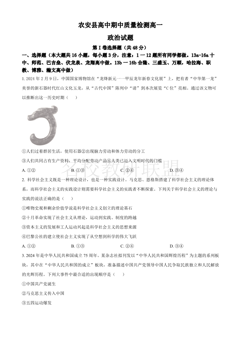 吉林省长春市农安县2024-2025学年高一上学期期中考试 政治