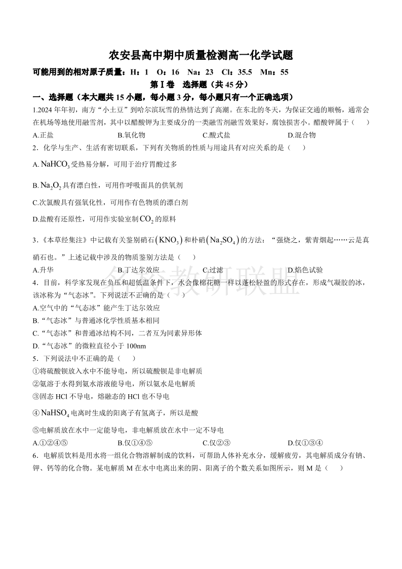 吉林省长春市农安县2024-2025学年高一上学期期中考试 化学