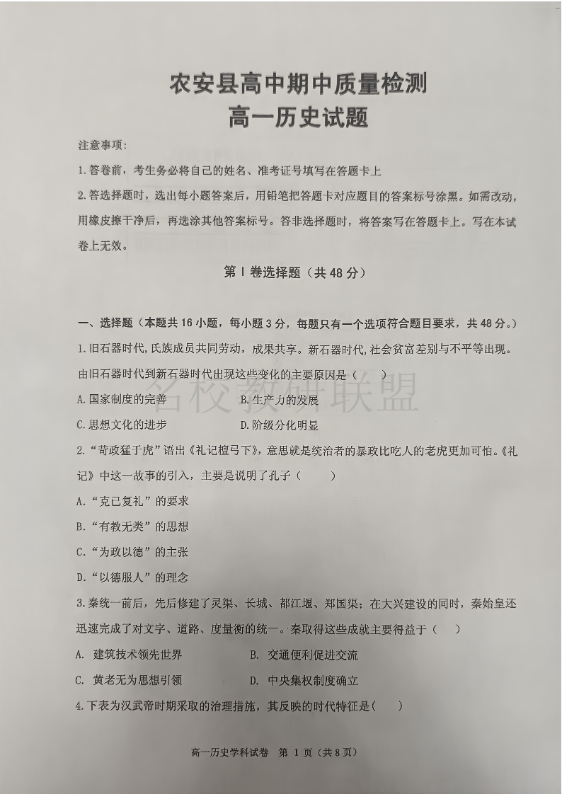 吉林省长春市农安县2024-2025学年高一上学期期中考试 历史