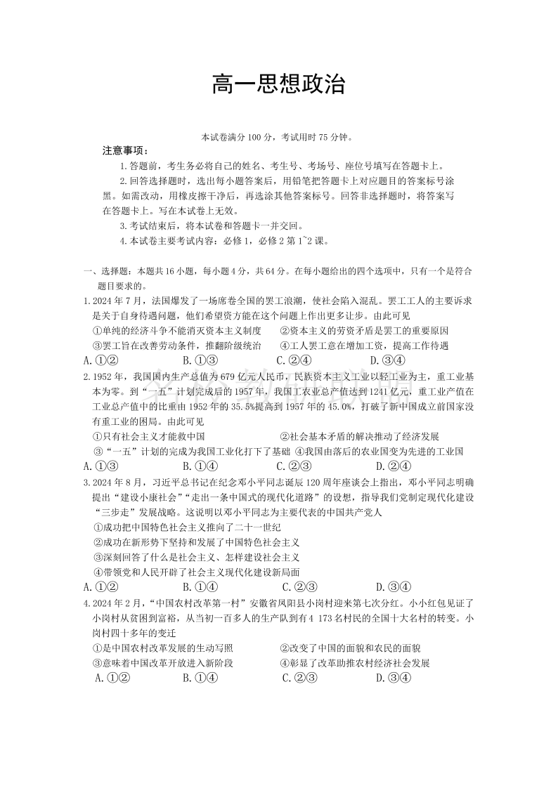 广东省佛山市H7联盟2024-2025学年高一上学期12月联考 政治
