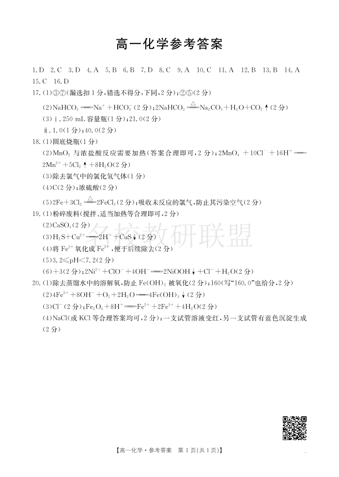 广东省佛山市H7联盟2024-2025学年高一上学期12月联考 化学答案