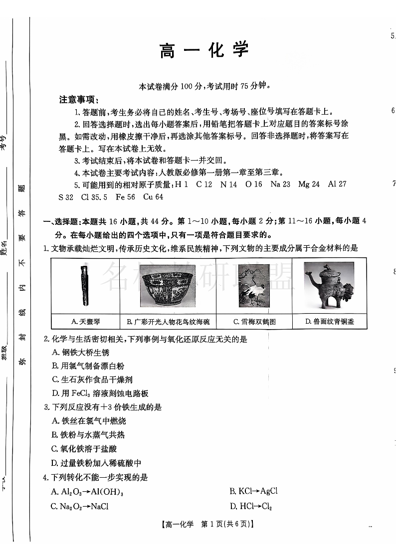 广东省佛山市H7联盟2024-2025学年高一上学期12月联考 化学