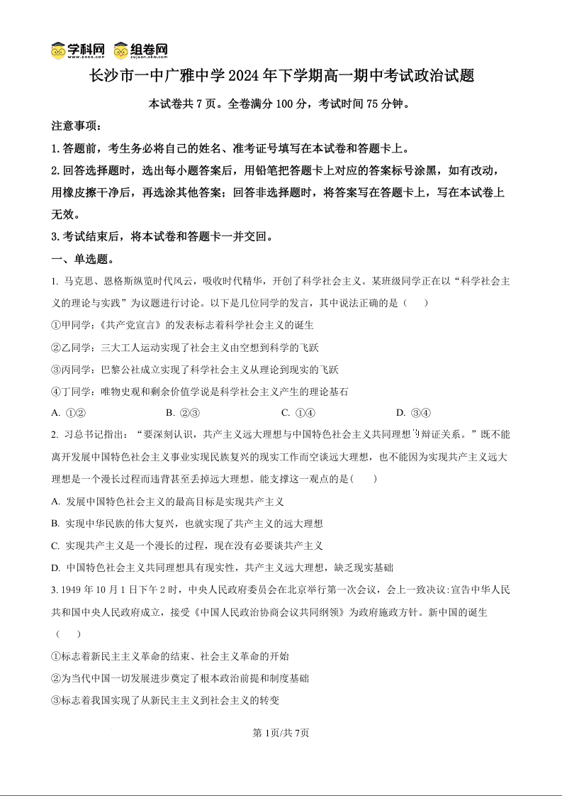 长沙市一中广雅中学2024-2025学年高一上学期11月期中考试 政治