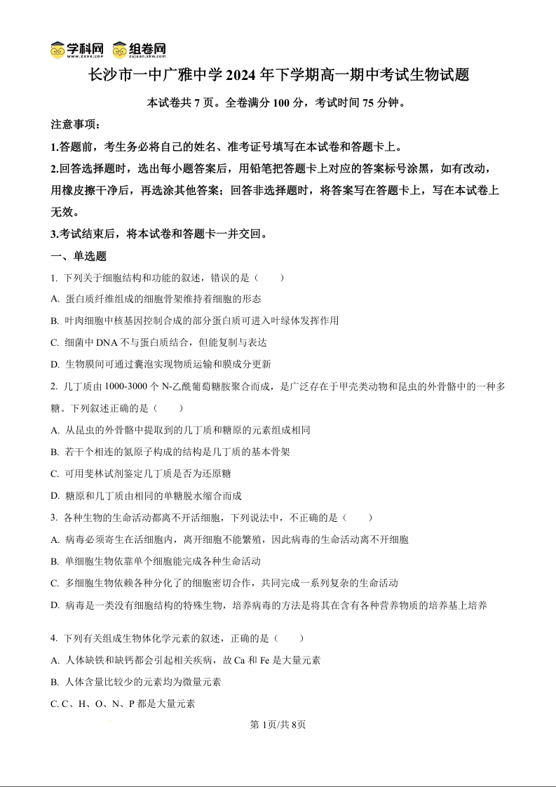 长沙市一中广雅中学2024-2025学年高一上学期11月期中考试 生物