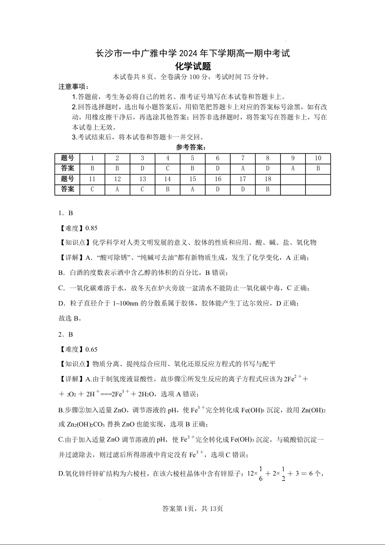 长沙市一中广雅中学2024-2025学年高一上学期11月期中考试 化学答案