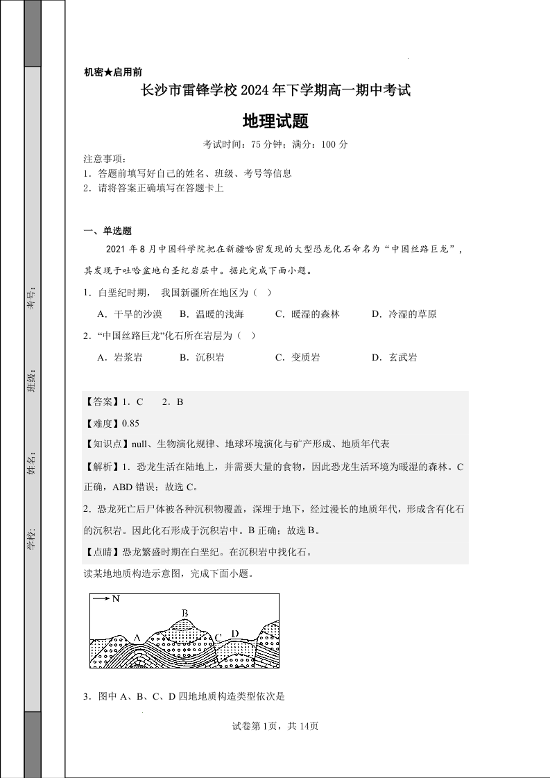长沙市雷锋学校2024-2025学年高一上学期12月期中考试 地理答案
