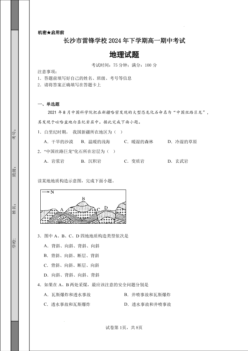 长沙市雷锋学校2024-2025学年高一上学期12月期中考试 地理