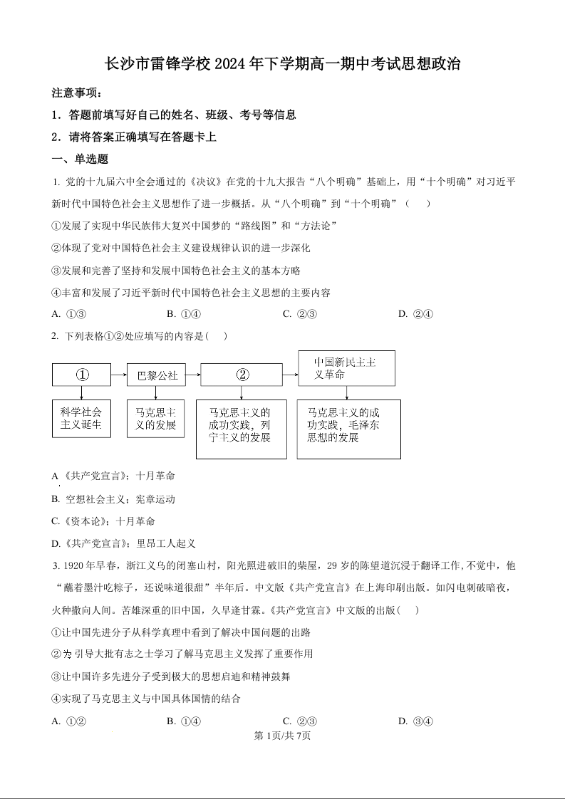 长沙市雷锋学校2024-2025学年高一上学期12月期中考试 政治