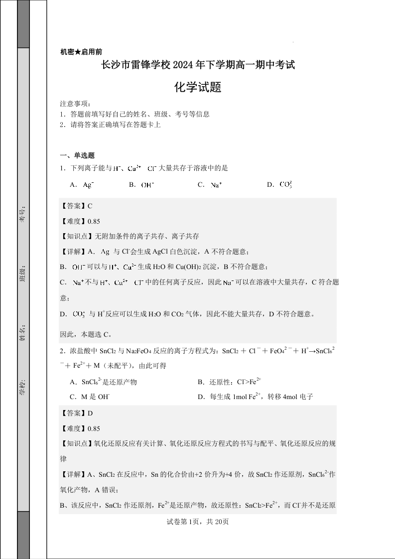 长沙市雷锋学校2024-2025学年高一上学期12月期中考试 化学答案